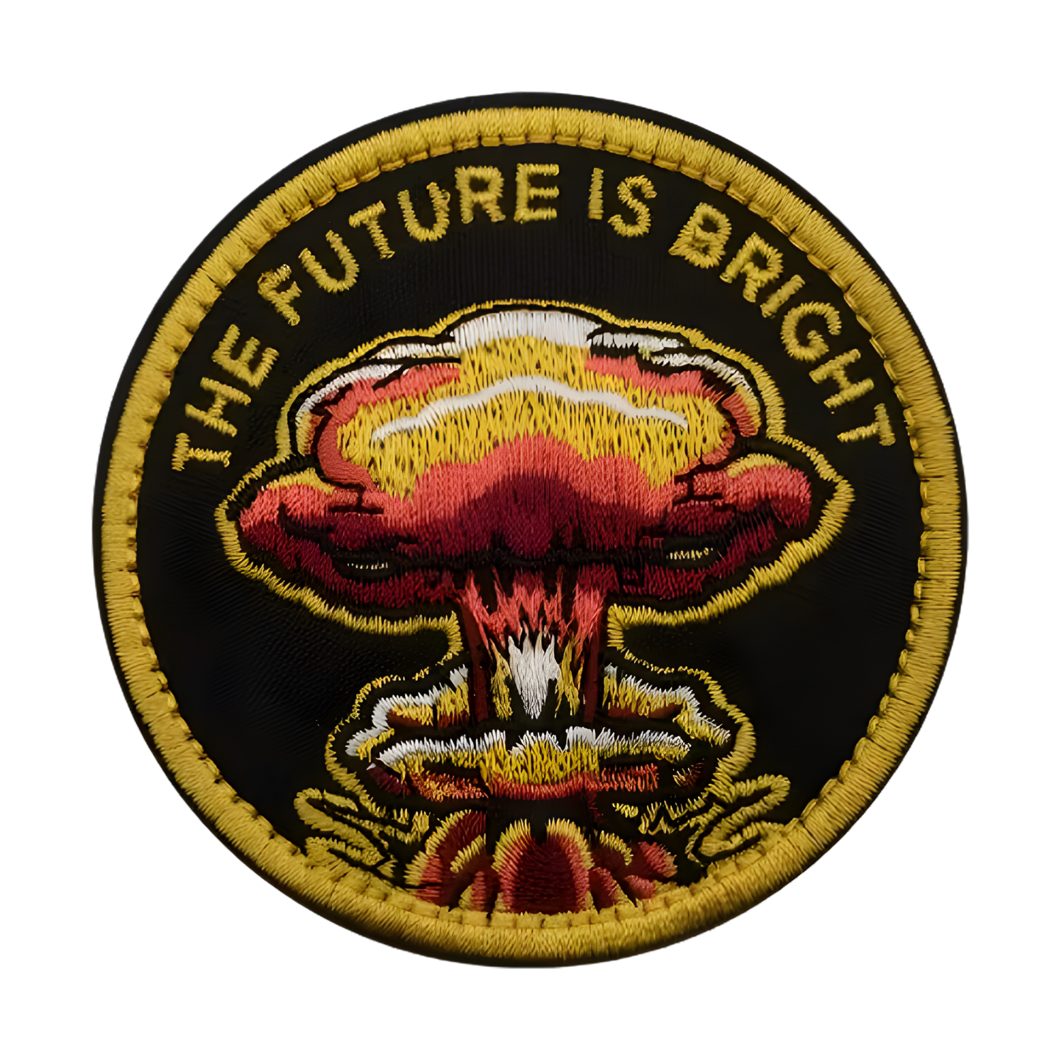 The high-density stitching captures intense colours red, yellow, orange, and white, giving the mushroom cloud a striking, detailed look. The statement “THE FUTURE IS BRIGHT” adds a satirical twist that stands out without being over the top.